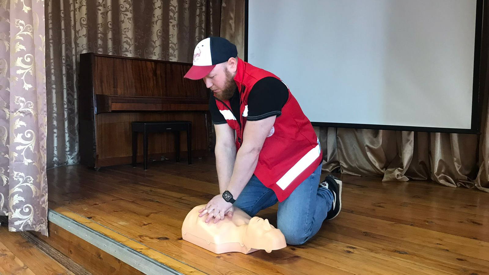 Практическими навыками поделился старший фельдшер ЦРБ Ильдар Мустафин. Рассказав основные правила оказания первой помощи, он на примере показал проведение сердечно-лёгочной реанимации и прием Геймлиха.