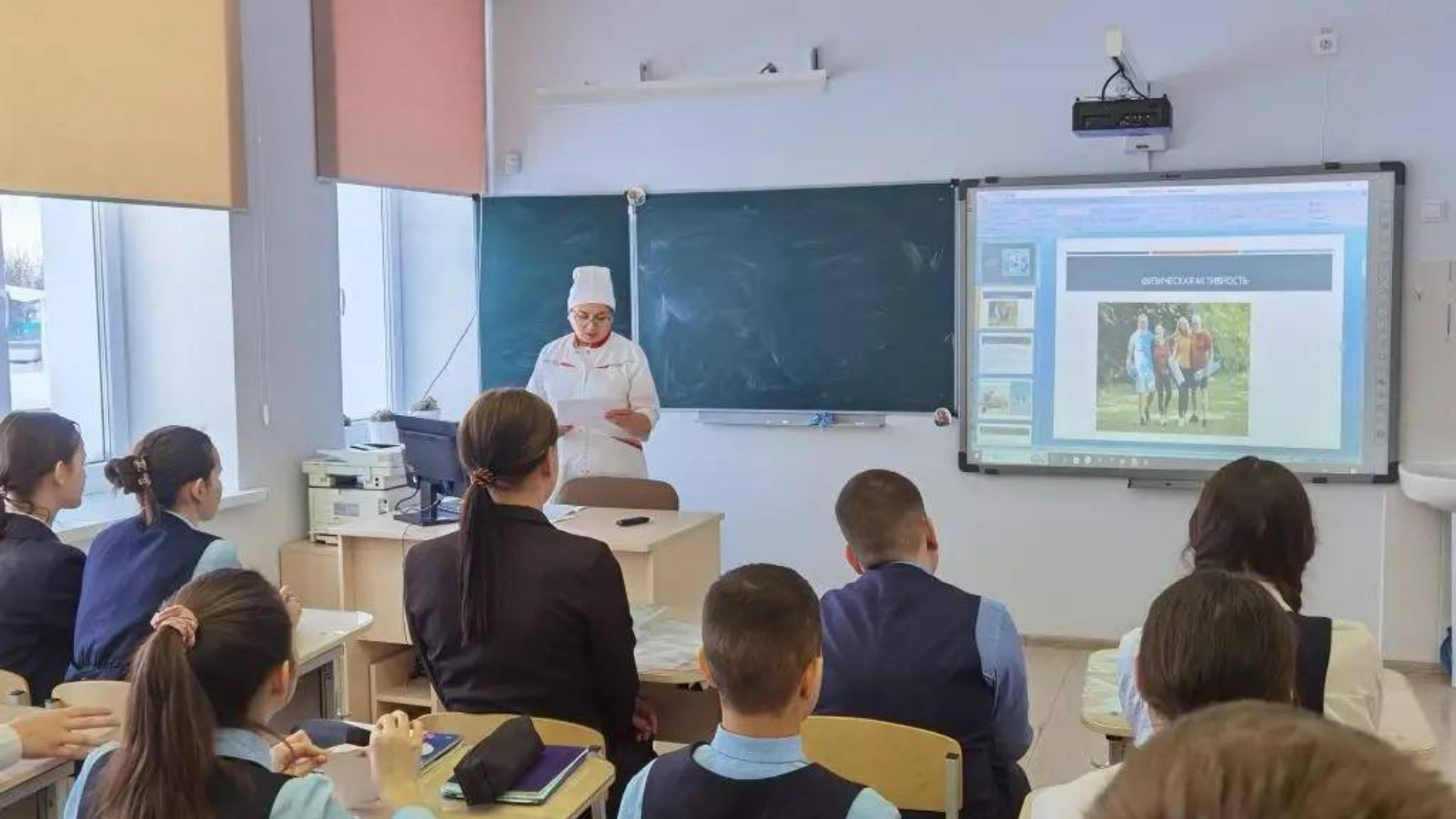 Фельдшер Алатского ФАПа Рамиля Бикинеева решила рассказать детям о пользе физической активности на практике: вместе с учениками она провела зарядку. Прямо в классе они выполнили несколько упражнений, таким образом она показала, что не обязательно иметь специальный спортивный инвентарь, чтобы заниматься спортом.